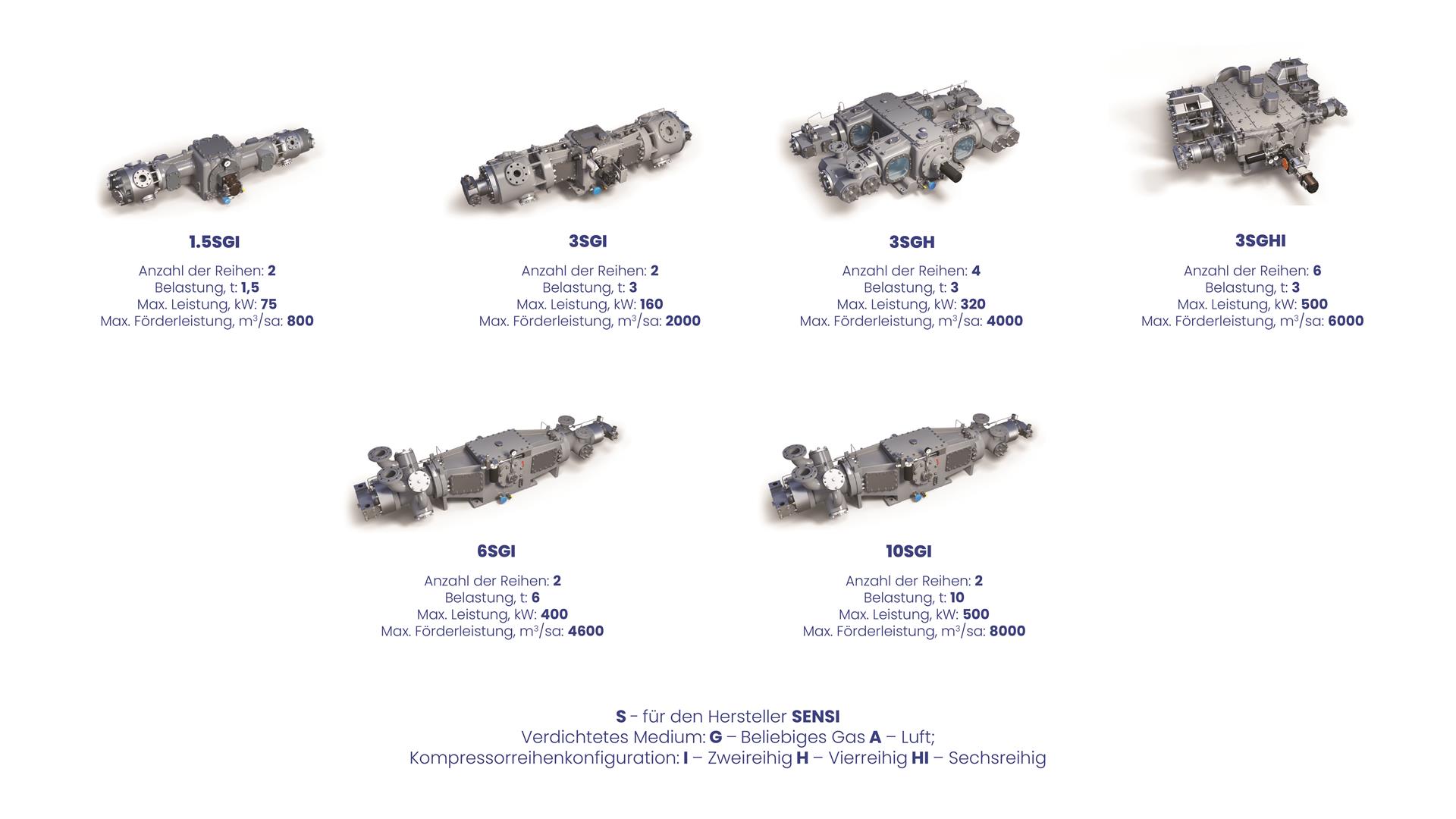 Entwickelt für: Die Unterstützung technologischer Prozesse beim Betrieb von Gasförderanlagen, die Verdichtung von Begleitgas (APG) zur Einspeisung in Hauptpipelines sowie den Einsatz als Boosterkompressoren zur Vorverdichtung von Erdgas an Gastankstellen und anderen Anlagen, die mit niedrigem Eingangsdruck aus Gasnetzen arbeiten. Außerdem werden sie in Luftzerlegungsanlagen zur Herstellung von Stickstoff und Sauerstoff eingesetzt.
